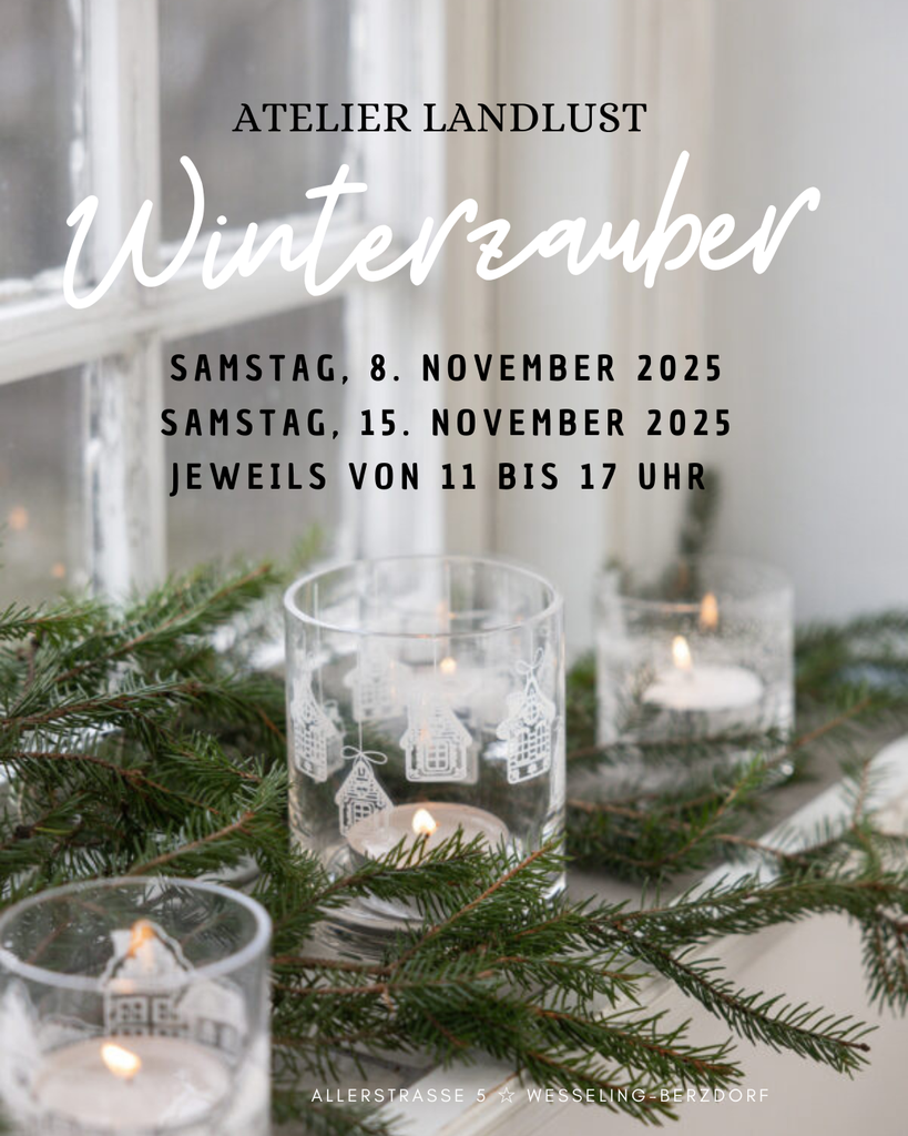 Wir möchten mit Euch unseren WINTERZAUBER eröffnen und laden Euch gerne am Samstag, den 8. November und Samstag, den 15. November 2025 jeweils von 11 bis 17 Uhr zu uns ins ATELIER LANDLUST nach Wesseling- Berzdorf ein!